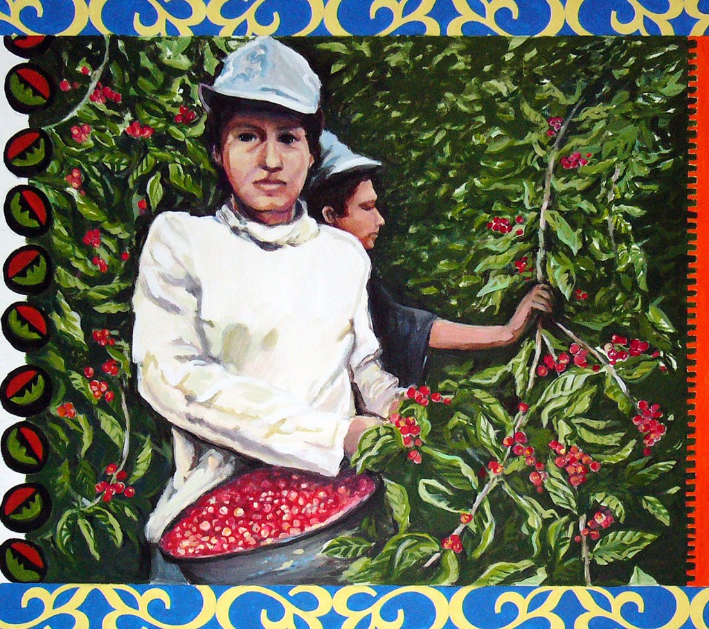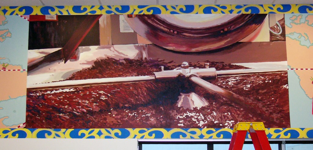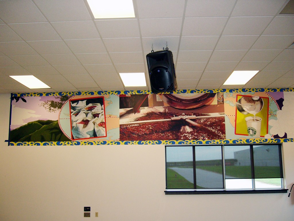 I was asked to design some murals to liven up the employee break room inside the Starbucks Roasting Plant facility. The murals were to “tell the story of coffee”, from its origins in the jungles of Central America all the way to the cup of coffee served to you in a Starbucks store.